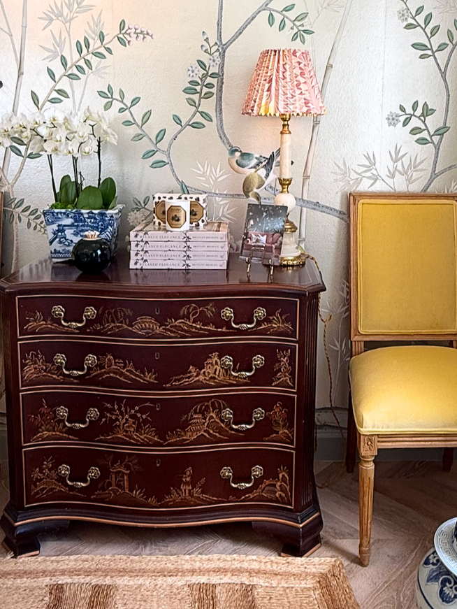 Chinoiserie painted mahogany chest with dovetail drawers and brass hardware. From the Jasper Cabinet Company.